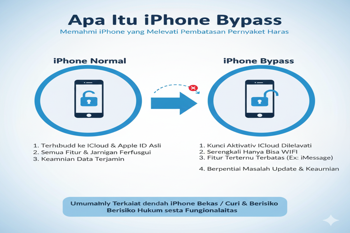 Apa Itu iPhone Bypass merujuk pada metode tidak resmi untuk melewati Activation Lock iCloud agar perangkat bisa digunakan tanpa Apple ID asli. Meskipun terlihat menguntungkan karena harga lebih murah, iPhone bypass memiliki banyak keterbatasan seperti tidak bisa update iOS, tidak bisa login iCloud, fungsi SIM tidak aktif, serta tidak memiliki garansi resmi.