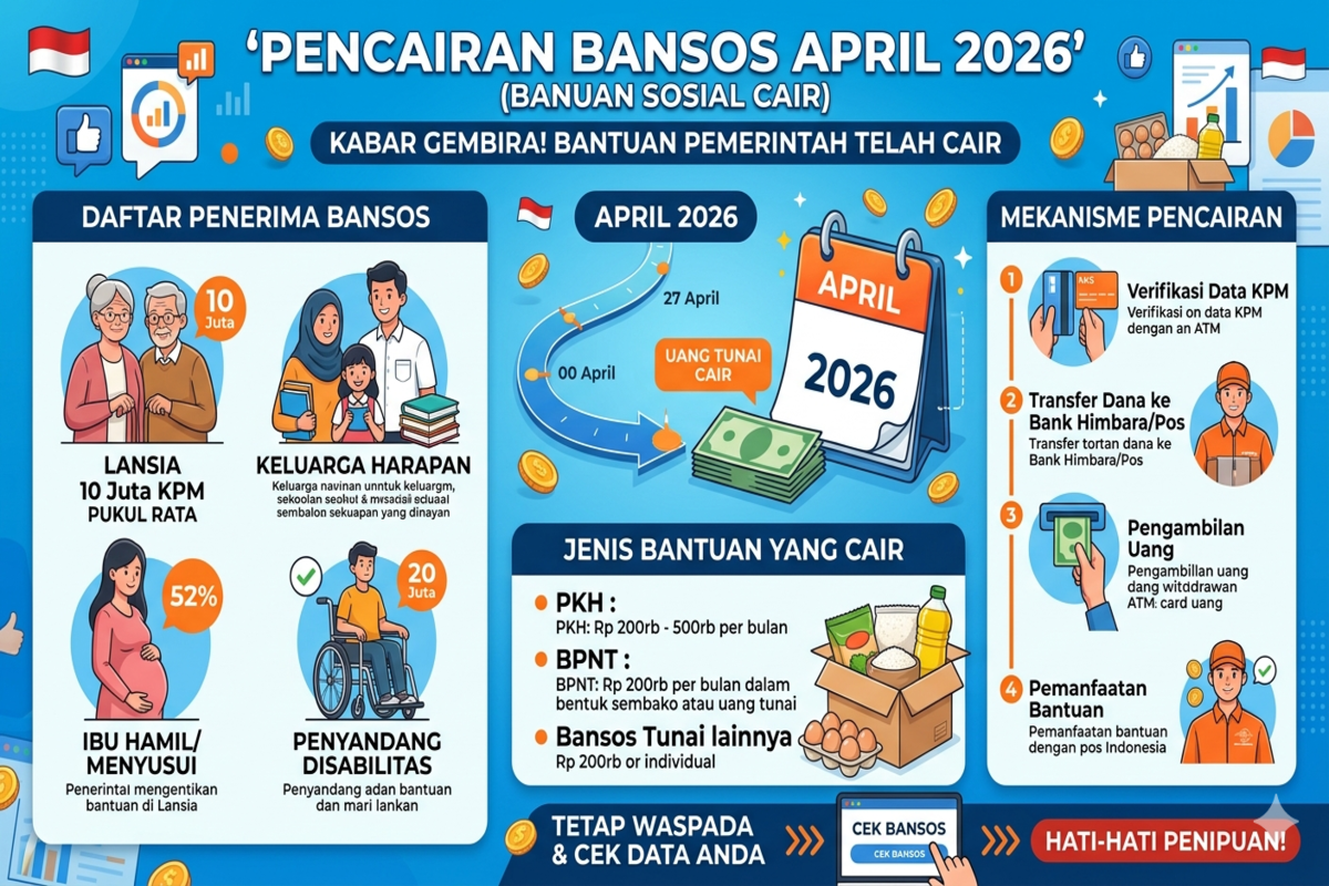 Bansos April 2026 cair menjadi kabar penting bagi banyak keluarga di Indonesia karena berbagai program bantuan seperti PKH, BPNT, bantuan beras, PIP, dan BPJS PBI kembali disalurkan secara bertahap. Bantuan ini tidak hanya membantu memenuhi kebutuhan dasar, tetapi juga menjaga stabilitas ekonomi keluarga dan masyarakat.