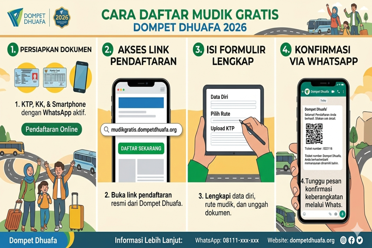 Cara Daftar Mudik Gratis Dompet Dhuafa 2026 menjadi informasi penting bagi masyarakat prasejahtera yang ingin pulang kampung tanpa terbebani biaya. Dengan kuota 750 peserta dan jadwal keberangkatan 14 Maret 2026, pendaftaran perlu dilakukan secepat mungkin sebelum ditutup.