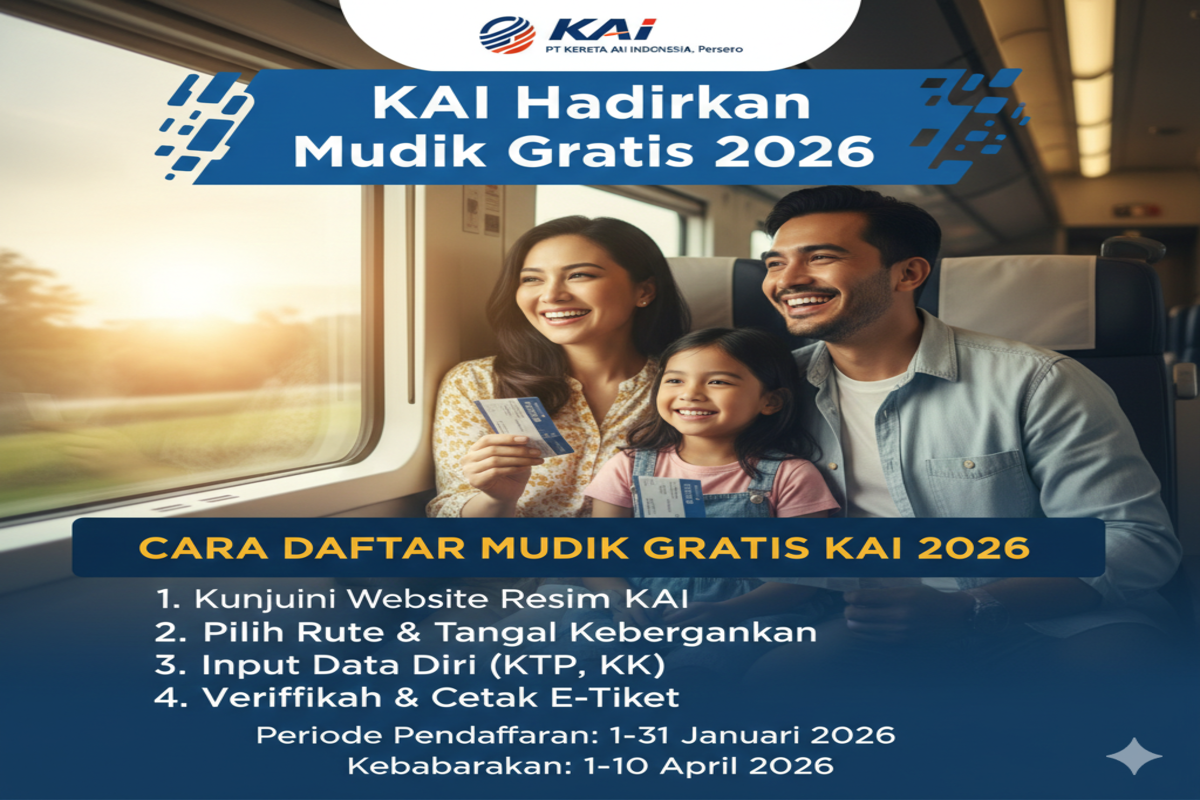Di tahun 2026, program Cara Daftar Mudik KAI Gratis 2026 kembali menjadi perhatian karena menyediakan kuota ribuan kursi kereta api untuk masyarakat. Program ini biasanya diselenggarakan oleh PT Kereta Api Indonesia atau bekerja sama dengan kementerian dan BUMN lain sebagai bagian dari program mudik gratis Lebaran 2026.