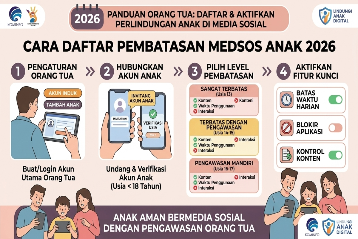 Cara daftar pembatasan medsos anak 2026 menjadi langkah penting bagi orang tua yang ingin memastikan anak menggunakan internet secara aman dan sehat. Melalui fitur parental control dan family supervision yang tersedia di berbagai platform media sosial, orang tua dapat mengatur akses, waktu penggunaan, serta jenis konten yang dapat dilihat oleh anak.