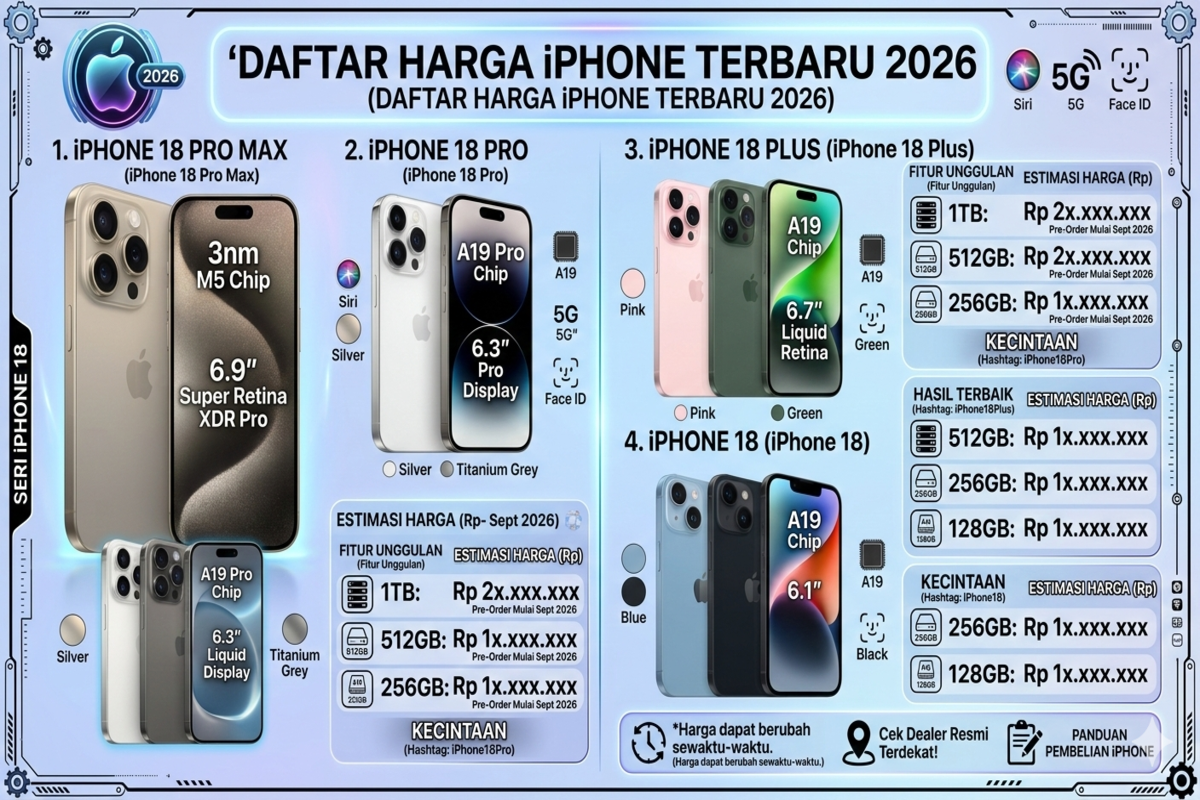 Harga iPhone di Indonesia bisa berbeda antar toko atau distributor resmi. Namun kisaran berikut merupakan gambaran umum harga iPhone terbaru yang beredar di pasaran pada awal Maret 2026.