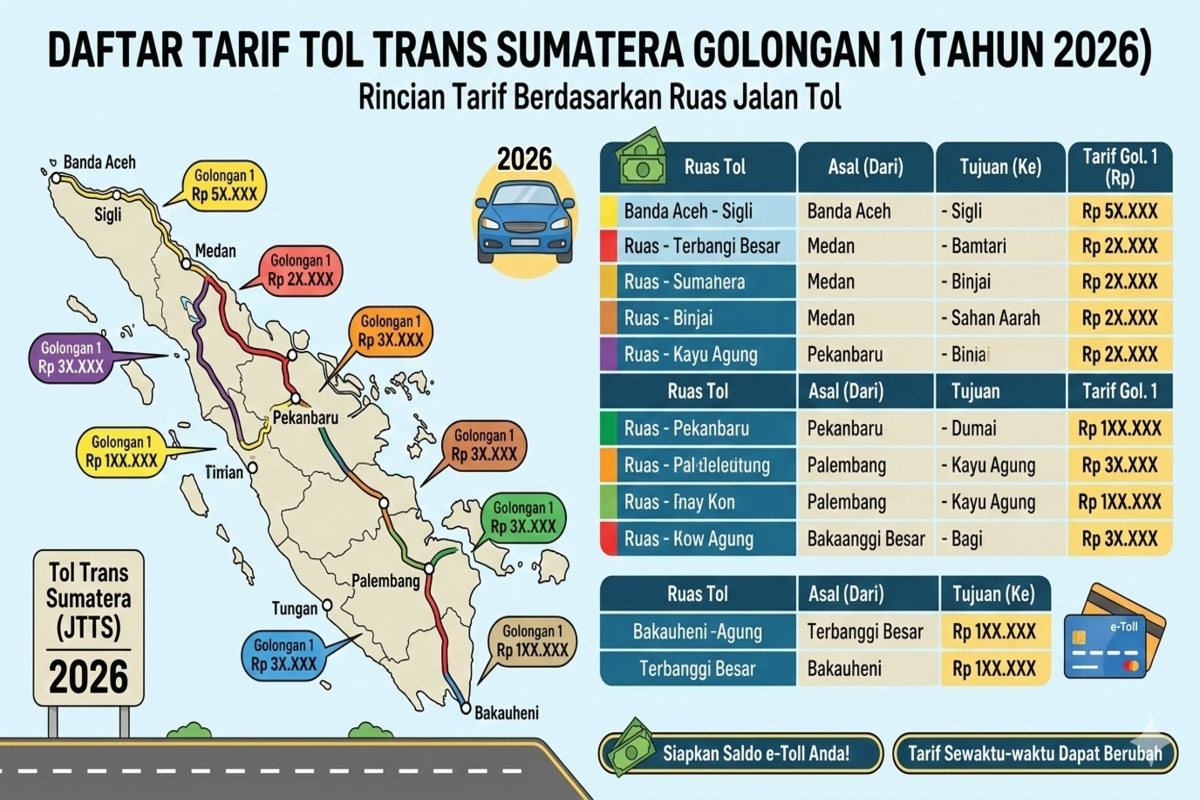 Informasi mengenai daftar tarif tol Pulau Sumatera golongan 1 2026 sangat penting bagi masyarakat yang ingin melakukan perjalanan darat, terutama saat musim mudik Lebaran. Setiap ruas tol memiliki tarif yang berbeda tergantung jarak dan wilayah yang dilalui.