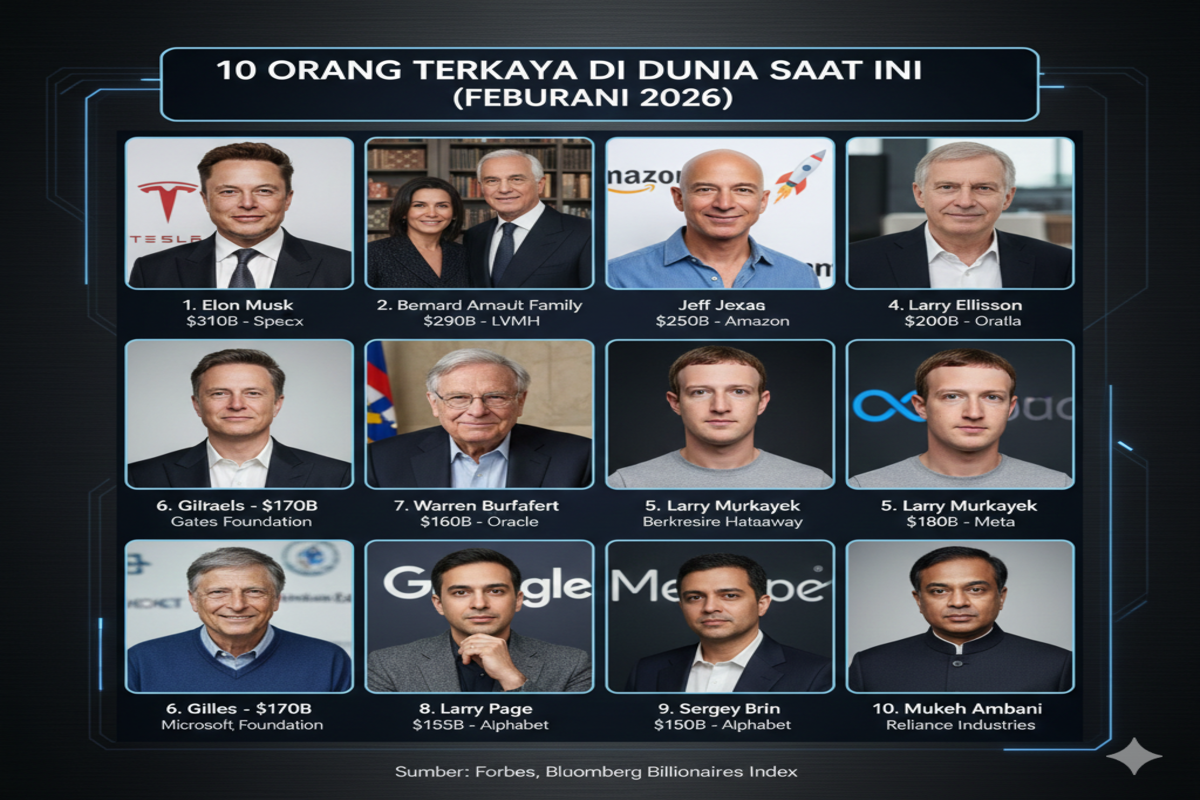 Dalam beberapa tahun terakhir, terutama sejak ledakan teknologi kecerdasan buatan (AI) dan digitalisasi ekonomi, kekayaan orang terkaya dunia terus mengalami perubahan besar.