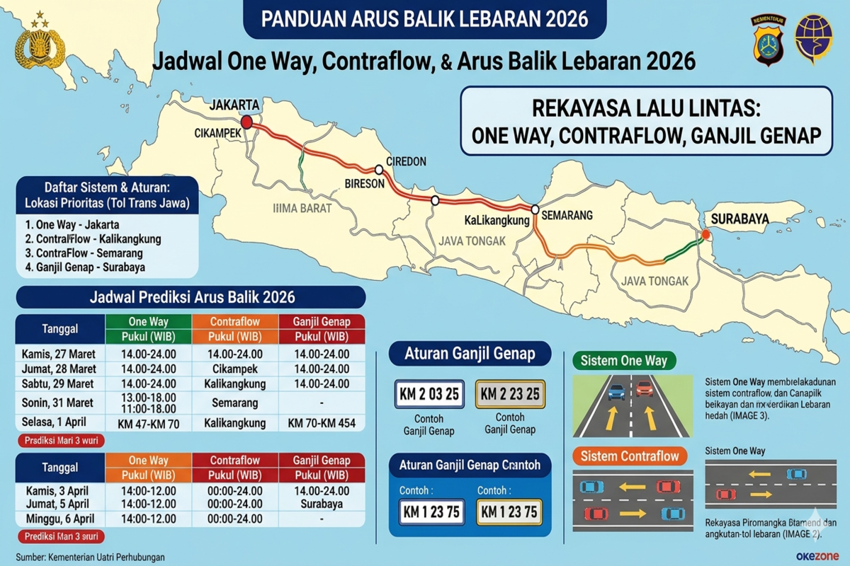 Jadwal one way contraflow dan ganjil genap arus balik 2026 menjadi informasi penting bagi siapa pun yang berencana kembali dari kampung halaman setelah libur Lebaran. Dengan memahami lokasi dan waktu pemberlakuan rekayasa lalu lintas, perjalanan dapat direncanakan dengan lebih baik.
