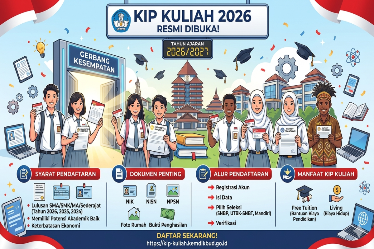 Pembukaan KIP Kuliah 2026 menjadi kesempatan besar bagi siswa yang ingin melanjutkan pendidikan tinggi tetapi terkendala biaya. Program ini memberikan bantuan biaya kuliah sekaligus dukungan finansial untuk kebutuhan hidup selama masa studi.